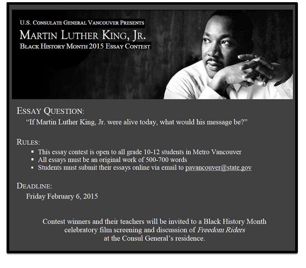 The United States Consulate General in Vancouver would like to bring to your attention an exciting opportunity for your students. In recognition of upcoming Black History Month and Martin Luther King Jr. Day, we are holding an essay contest!