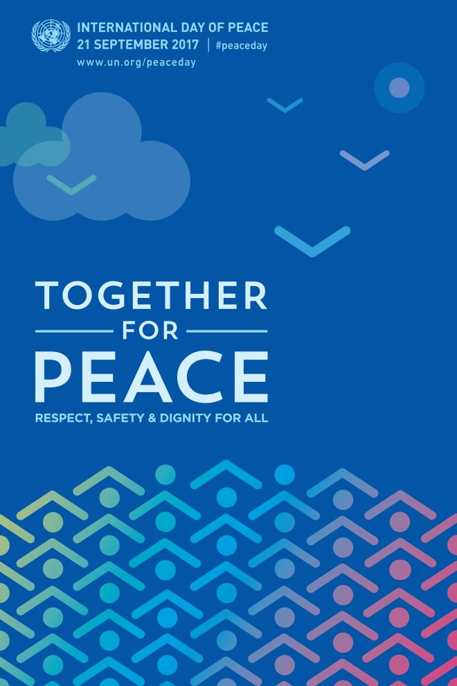 From the United Nations: Each year the International Day of Peace is observed around the world on 21 September. The General Assembly has declared this as a day devoted to strengthening the ideals of peace, both within and among all nations and peoples. The theme for 2017 is “Together for Peace: Respect, Safety and Dignity for All.”