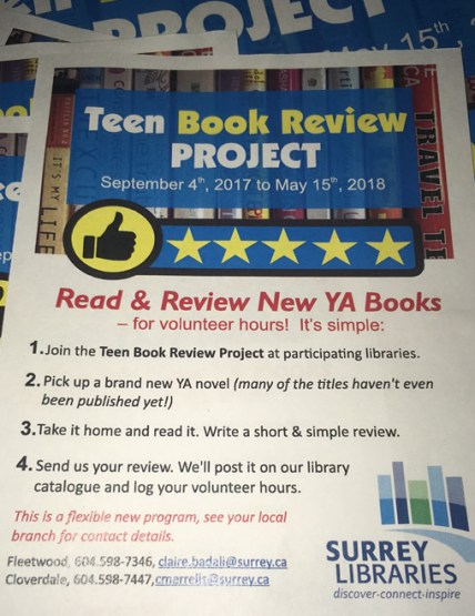 Teen Book Review Project Read and Review New YA Books! Earn volunteer hours! Get access to titles that haven’t even been published yet. Find out. Visit the Cloverdale Branch of Surrey Libraries or contact: cmerrells@surrey.ca 604.598.7447 Share this: Click to share on X (Opens in new window) X Click to email a link to a friend (Opens in new window) Email More Click to share on LinkedIn (Opens in new window) LinkedIn Click to share on Reddit (Opens in new window) Reddit Click to share on Pinterest (Opens in new window) Pinterest Click to print (Opens in new window) Print Click to share on Facebook (Opens in new window) Facebook Click to share on Tumblr (Opens in new window) Tumblr Click to share on Pocket (Opens in new window) Pocket Click to share on Telegram (Opens in new window) Telegram Click to share on WhatsApp (Opens in new window) WhatsApp Like Loading... Related Published by Mr. X from parts unknown, weight, unknown View all posts by Mr. X