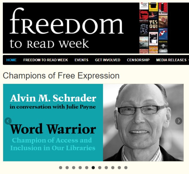 Learn about Alivin Schrader and other “Champions of Free Expression” at freedomtoread.ca . These people and countless others lead the fight for our rights and freedoms. Find out more about them and get inspired to join the fight.