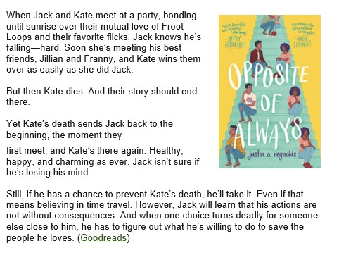 Come down to the School Library to have a look at Opposite of Always by Justin A. Reynolds, and the other Surrey Teens Read selections for 2020-2021. You can also go online and borrow many of them as e-Books and/or Digital Audiobooks.