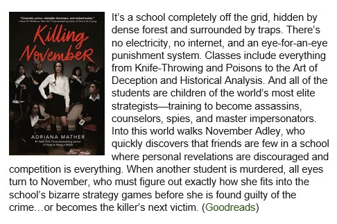 Come down to the School Library to have a look at Killing November by Adriana Mather, and the other Surrey Teens Read selections for 2020-2021.  You can also go online and borrow many of them as e-Books and/or Digital Audiobooks.