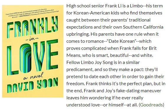 Come down to the School Library to have a look at Frankly in Love by David Yoon, and the other Surrey Teens Read selections for 2020-2021. You can also go online and borrow many of them as e-Books and/or Digital Audiobooks.