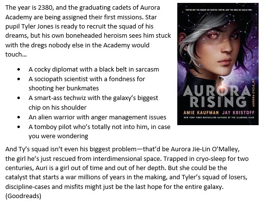 Come down to the School Library to have a look at Aurora Rising by Amie Kaufman & Jay Kristoff, and the other Surrey Teens Read selections for 2020-2021. You can also go online and borrow many of them as e-Books and/or Digital Audiobooks.