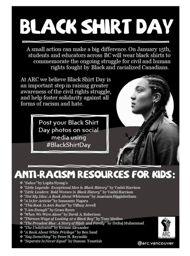 Show solidarity in the fight against racism. Help raise awareness for the ARC and other anti-racist efforts by wearing a black shirt to school tomorrow, Friday, January 15.