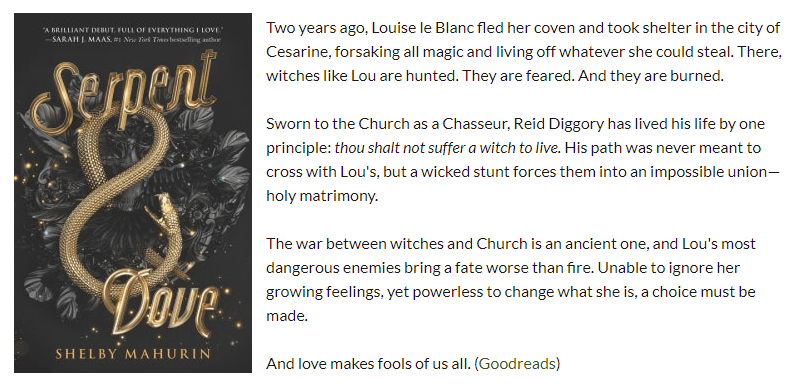 Surrey Teens Read has once again come up with an incredible list of titles for students to enjoy. This week we look at Serpent & Dove by Shelby Mahurin.