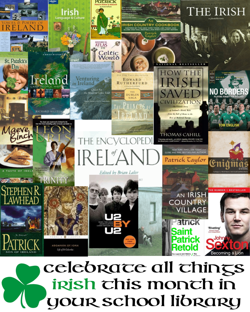 St. Paddy’s Day is March 17th, but we are celebrating ALL MONTH in your School Library! Come down to check out our display of Irish & Ireland related titles, including both fiction and non-fiction.