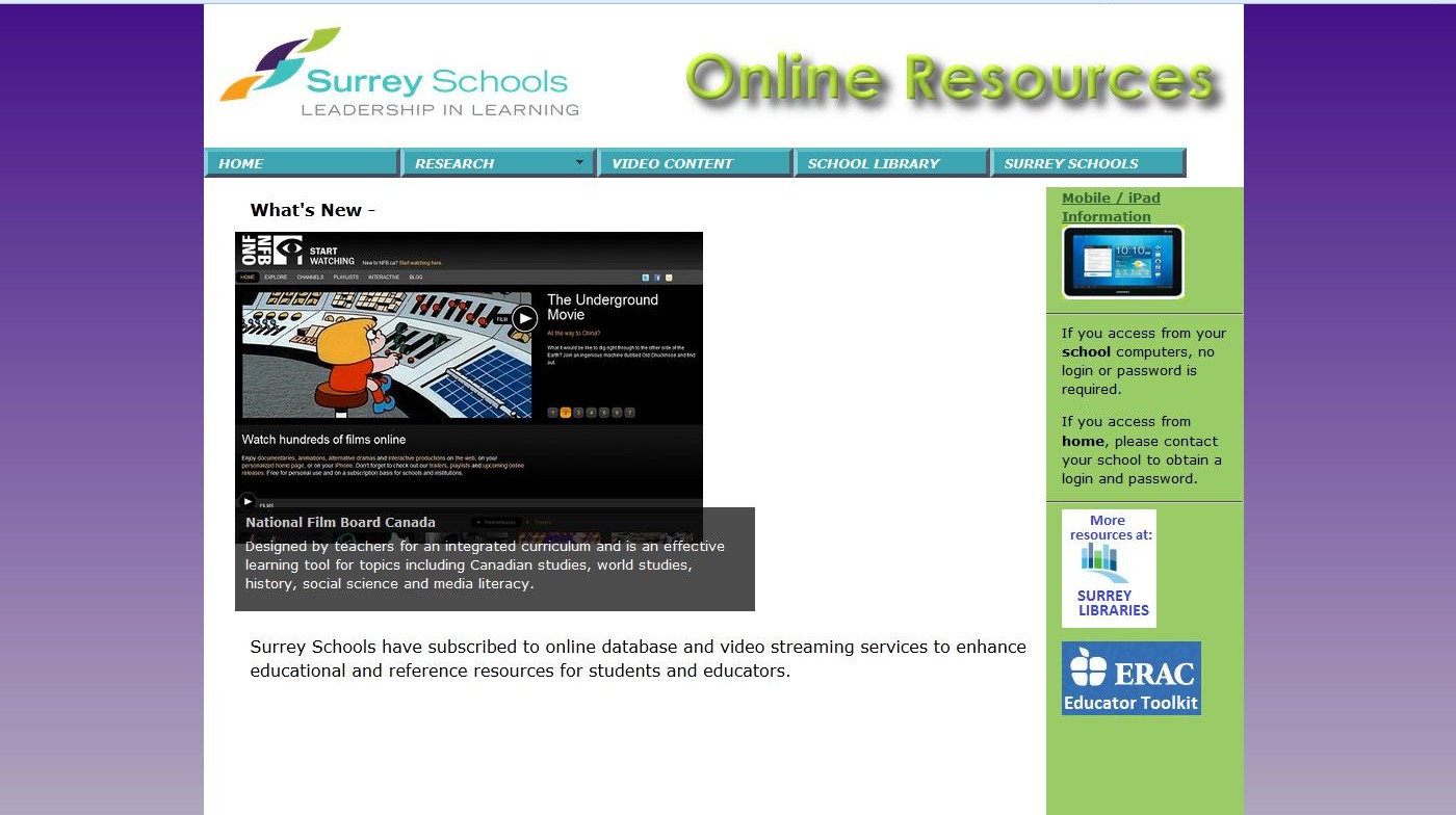 Students, you are missing out if you are not making use of our district sponsored online resources. Check out the wide variety of excellent resources that are available to you, free of charge, if you are a Surrey Schools student. Note that if you are attempting to gain access from a school computer or tablet, you will be able to get in directly. However, from home you will need a username and password. See us at the School Library for that information.