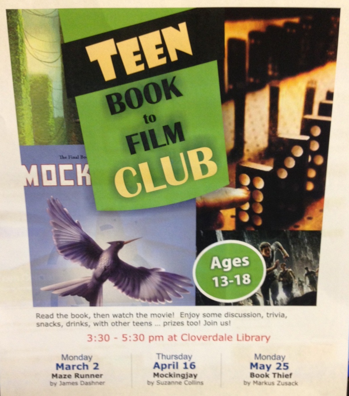 Check out the new “Teen Book to Film Club” at the Cloverdale Branch of Surrey Libraries. Read the books, watch the movies, enjoy some snacks, win some prizes!