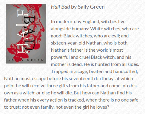 Half Bad is one of the books nominated for the Surrey Teens Read Book of the Year competition. Check out the other titles here at your school library. Find out more about Surrey Teens Read at surreyteensread.weebly.com